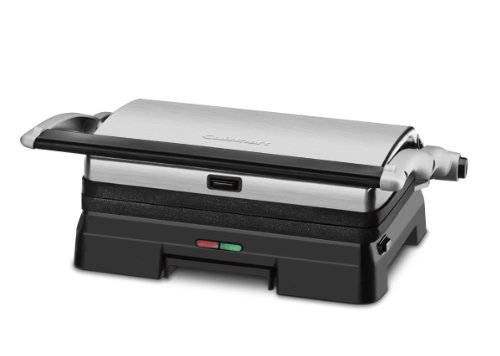 For succulent steaks, juicy burgers and crispy grilled sandwiches, look no further than the Cuisinart Griddler Grill and Panini Press. The unit's upper and lower nonstick, removable grill plates provide even grilling and toasting. The integrated drip tray makes it easy to drain grease away from food for healthier cooking. Designed like professional units, its floating hinge adjusts to accommodate any thickness for perfectly grilled thin or thick panini and sandwiches. The present temperature is ideal for grilling and takes the guesswork out of cooking to ensure crisp, golden-brown results. With 'Power On' and 'Ready to Cook' indicator lights, operation is simple. Even more, the GR-11 takes up minimal space and provides just enough surface area to cook for a couple of friends or family members.