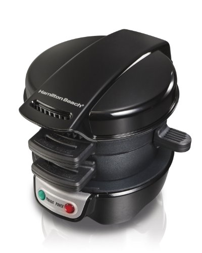 With the Hamilton Beach Breakfast Sandwich Maker, forget the fast food drive-through and enjoy a hot, homemade breakfast sandwich in under 5 minutes. Simply place the ingredients inside, build the base of your sandwich in the bottom layer, place the egg on the cooking plate and close the lid. Slide the cooking plate out and your sandwich assembles itself. Open the lid and your hot breakfast sandwich is ready to eat. The included recipe book provides a variety of breakfast sandwich options, from the traditional egg, ham and cheese to the unique cheddar, apple, bacon and egg croissant sandwich. **How to Use.** Once preheated, place the bottom half of your bread choice onto the bottom plate and top it with ingredients such as precooked meats, cheese and vegetables. Then, lower the top ring and cooking plate. Crack an egg onto the cooking plate and pierce the yolk. Place the other half of your bread selection on top of the egg and close the cover. After 5 minutes, rotate the cooking plate handle clockwise until it stops. Using an oven mitt, lift the ring assembly and cover via the bottom handle and voilà, your breakfast sandwich is complete. Simply remove the sandwich with a plastic or wooden utensil and enjoy!